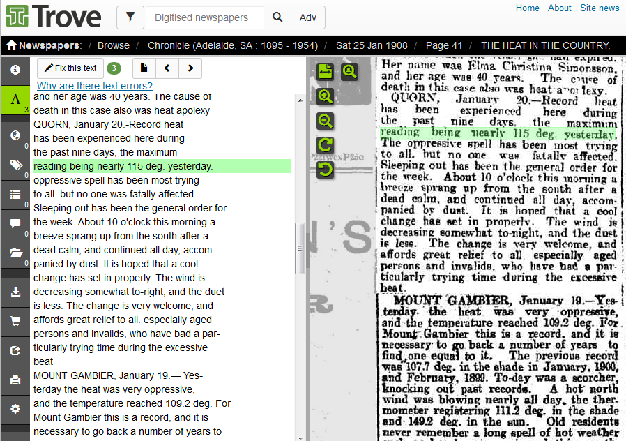 MOUNT GAMBIER, January 19.— Yesterday the heat was very oppressive, and the temperature reached 109.2 deg. For Mount Gambier this is a record, and it is necessary to go back a number of years to find one equal to it. The previous record was 107.7 deg. in the shade in January, 1900, and February, 1899. To-day was a scorcher, knocking out past records. A hot north wind was blowing nearly all day, the thermometer registering 111.2 deg. in the shade and 149.2 deg. in the sun. Old residents never remember a long spell of hot weather such as has been experienced this month.