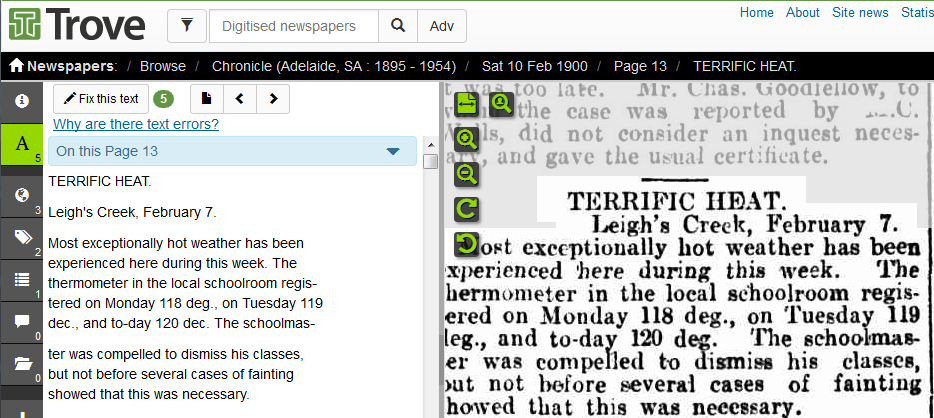 Most exceptionally hot weather has been experienced here during this week. The thermometer in the local schoolroom registered on Monday 118 deg., on Tuesday 119 dec., and to-day 120 dec. The schoolmaster was compelled to dismiss his classes, but not before several cases of fainting showed that this was necessary.