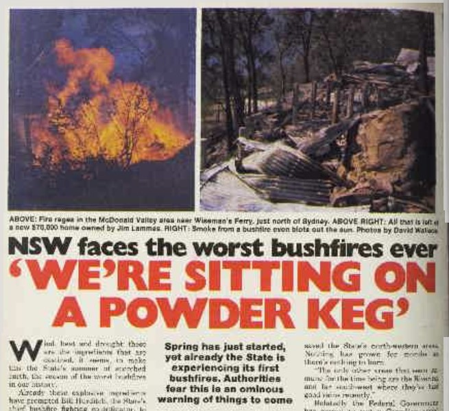 NSW faces the worst bushfires ever. 24 Sep 1980 ‘WE’RE SITTING ON A POWDER KEG. Spring has just started, yet already the State is experiencing its first bushfires.