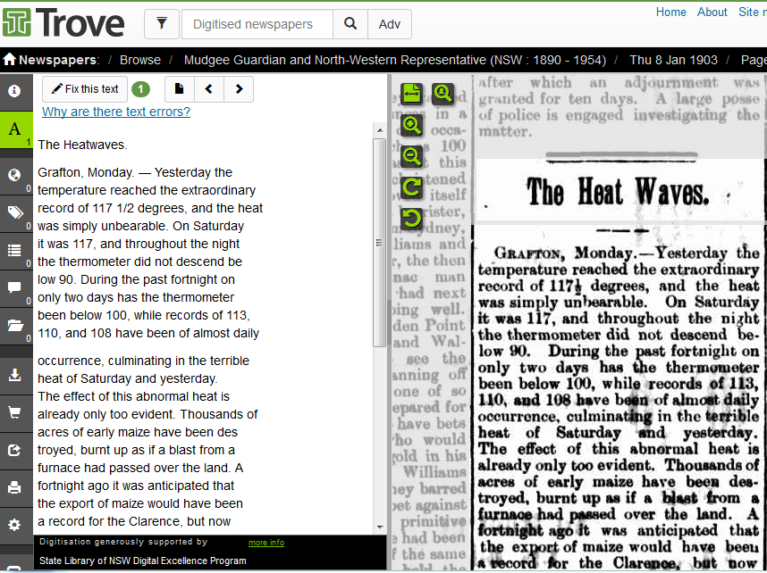 Grafton, Monday. — Yesterday the temperature reached the extraordinary record of 117 1/2 degrees, and the heat was simply unbearable. On Saturday it was 117, and throughout the night the thermometer did not descend be low 90. During the past fortnight on only two days has the thermometer been below 100, while records of 113, 110, and 108 have been of almost daily occurrence, culminating in the terrible
