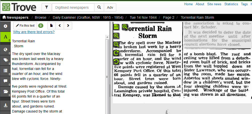 The dry spell over the Macleay was broken last week by a heavy thunderstorm. Accompanied by hail, torrential rain fell for a Quarter of an hour, and the wind blew with cyclonic force. Ninety-five points were registered at West. Kempsey Post Office. Of this total 66 points fell in a quarter of an hour. Street trees were torn about, and gardens ruined.